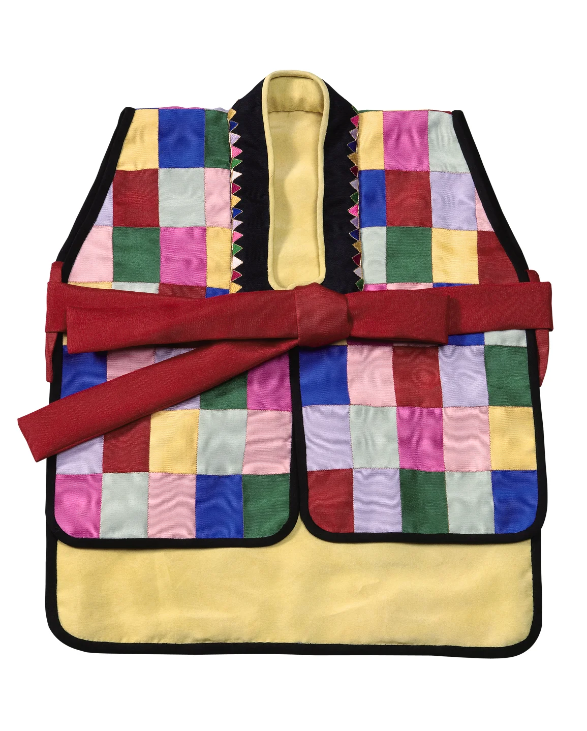 The outer robe and inside robe of yellow color are a set. At the beginning the red robe and yellow robe was made as a single layer each and wearing it together. But, passing down the generation after generation, red & yellow robe was combined as one layer and used it.