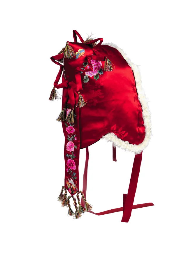 It’s a thermal hat for a child in a winter for the Northern area of Gyeonggi Province. It’s embroidered with peony on the outside and hanging the embroidered Daenggi on the back. On the knob of the hat, it’s decorated a long silk cord with stitching in places. There are wrappers for the both cheek on both sides so the child can make warm the cheek.