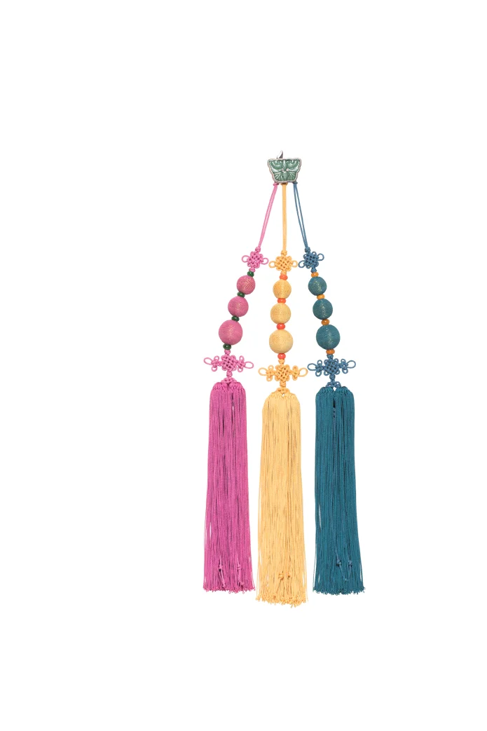 The 3 beads which symbolize So-Cheon, Jung-Cheon and Dae-Cheon world of Buddhism are tied up with 3 colors silk threads and plait knot with silk cord. It’s also hanged 2 pieces tassel which threaded with coral, amber and jade ring.